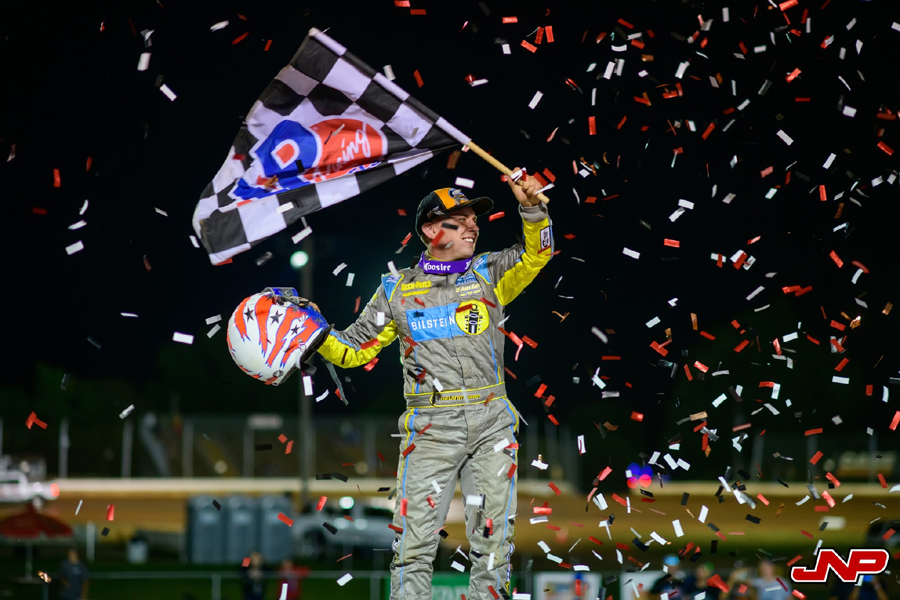 Devin Moran celebrates in victory lane at Sharon (OH) Speedway in 2022 - Jacy Norgaard Photo